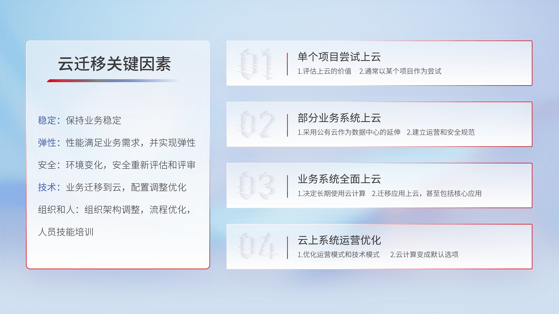 结合实际业务,,,从规划设计、、、云平台选型、、、云原生改造、、数据迁移、、集成交付,,,,迁移全过程为客户识别最佳上云路径,,做好风险识别管理,,,,设计网络架构、、、身份权限、、安全审计合规、、、操作审计、、、日志审计、、、、监控告警策略、、多站点容灾设计等,,,对云上基础设施进行整体规划,,,,提升IT治理水平,,,,以满足弹性、、、、高可用、、高性能的需求。。
