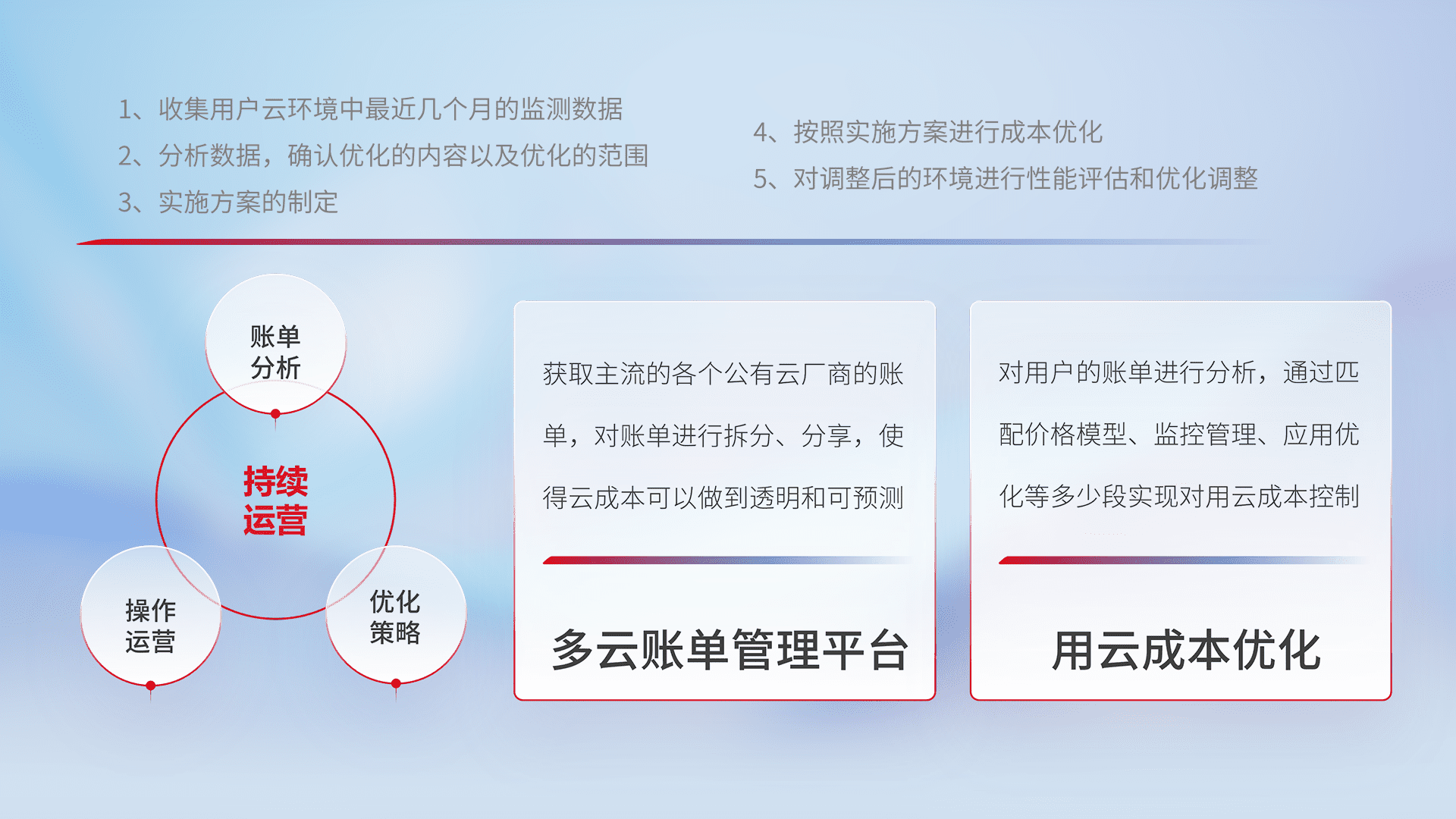 通过多云纳管,,,,以统一的资源数据模型把客户的云资源进行抽象和封装,,,,进而实现对多云资源的统一操作,,保障云资源管理的可靠性、、稳定性与可用性。。。。量身定制化运维内容,,,配置、、开发运维、、、补丁管理、、、备份、、监控、、、认证和访问管理、、审计和日常巡检等,,保障在用云过程中的可靠度,,稳定度以及高可用率。。。